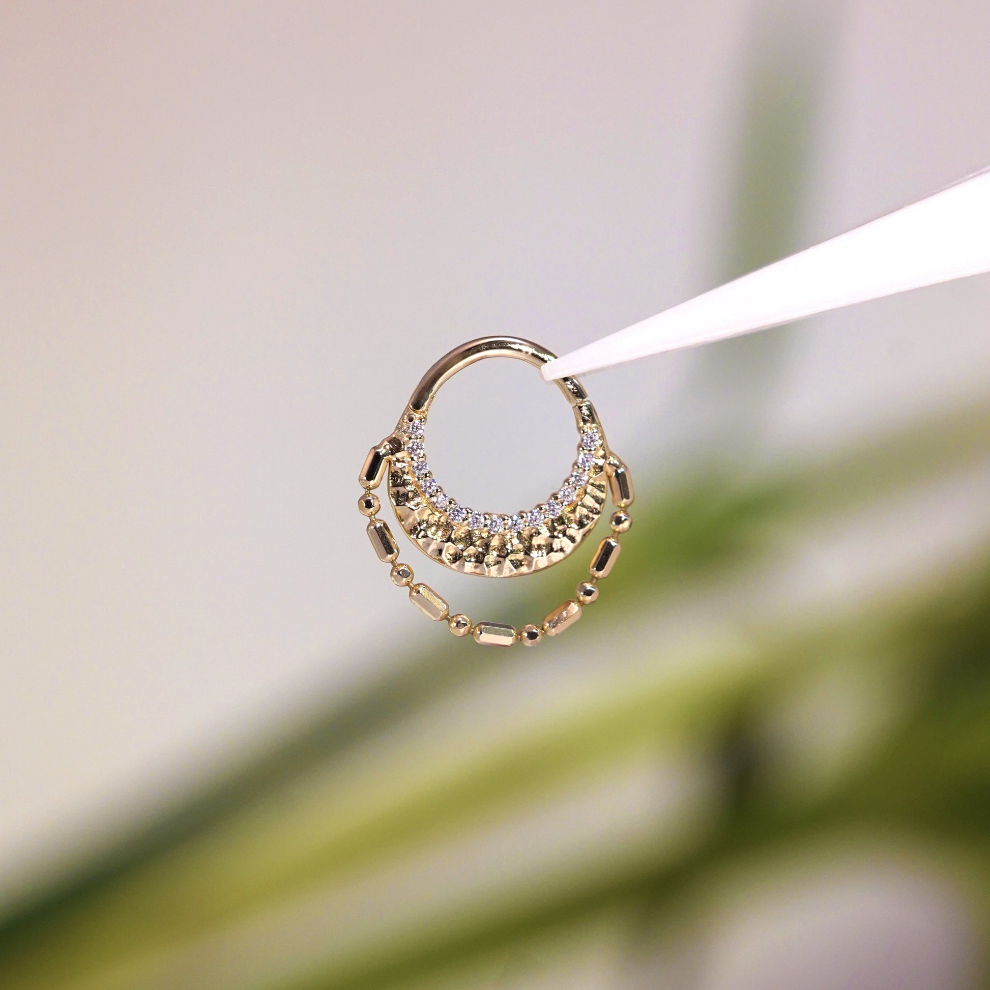 Orza draws from ancient textures and modern motion. This bold clicker fuses hand-hammered detailing with a full arc of sparkling white stones, anchored by a draping chain of geometric links for added depth and drama. Designed to elevate any septum or daith piercing, Orza is a sculptural statement with substance.